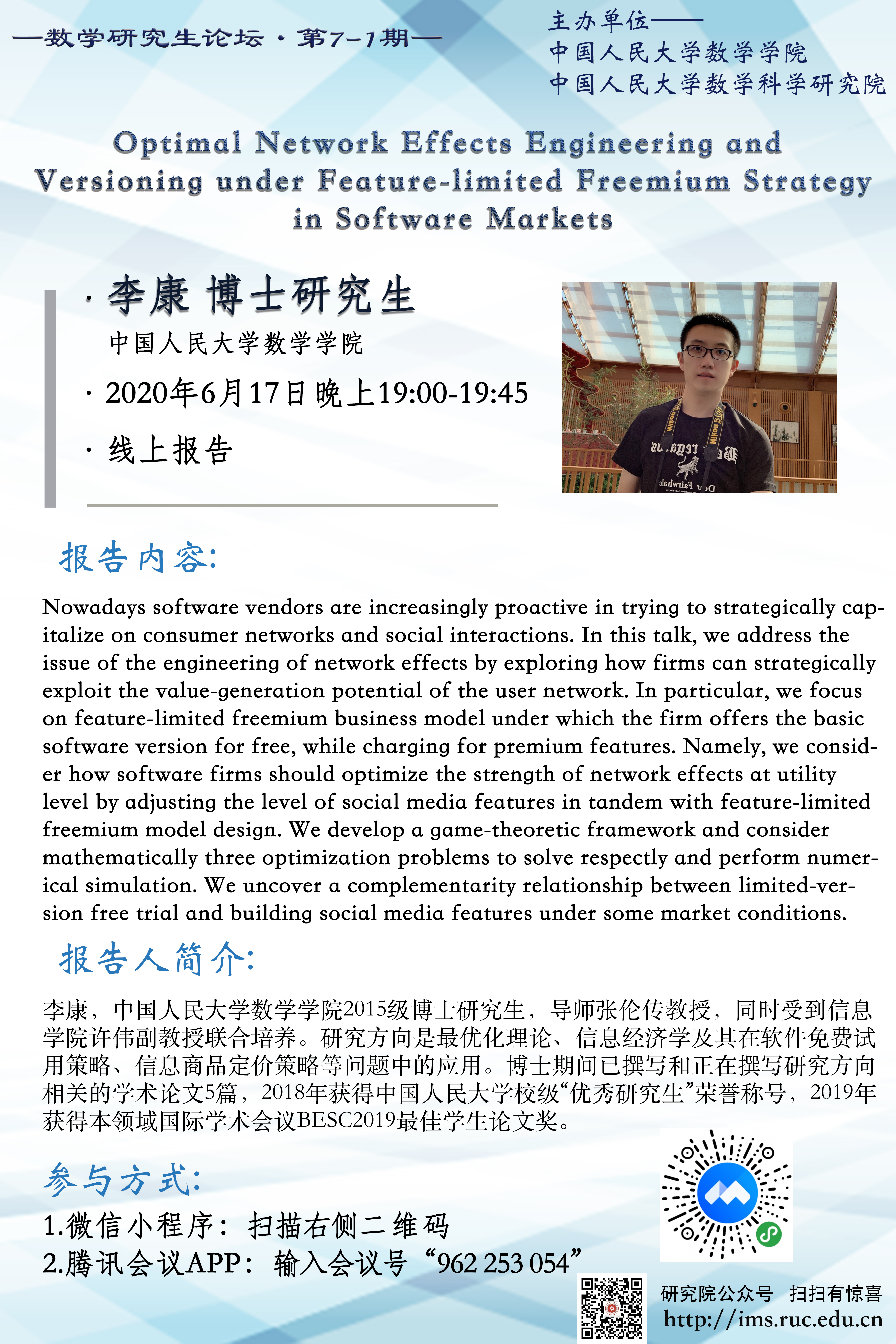 数学研究生论坛7-1期——Optimal Network Effects Engineering and Versioning under Feature-limited Freemium Strategy in software Markets