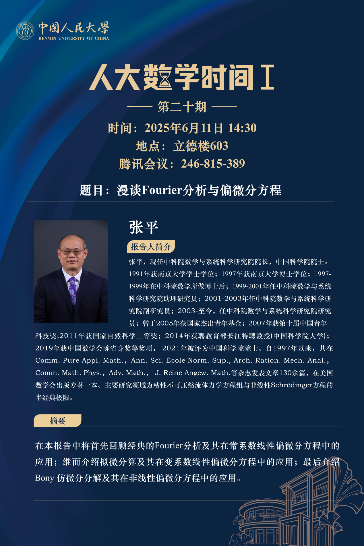 为促进学科交流融合、拓宽师生学术视野、释放科研创新活力,助力人大数学学科走向一流,91九色 设立“人大数学时间”,以专题研讨、高端学术论坛为载体,搭建数学思想充分碰撞、优秀人才不断涌流、创造活力竞相迸发的舞台。“人大数学时间”将持之以恒,久久为功,立志通过交流与创新、提出重大问题,引领数学学科及相关领域的创新与发展,成为对我国数学发展有贡献意义的平台。以下为“人大数学时间I”第二十期信息: