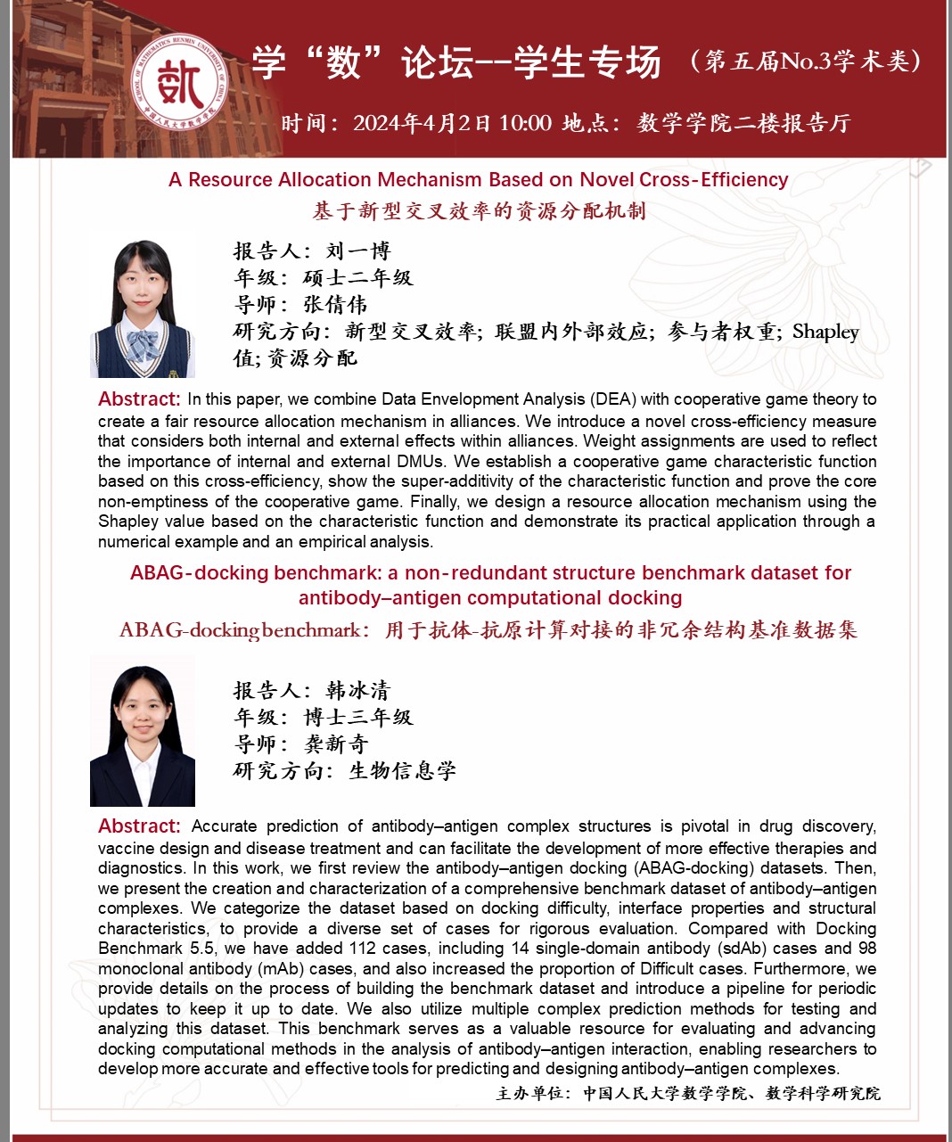 大家好,本届学“数”论坛——学生专场的第三场报告来啦!本场报告类型为学术类,将于2024年4月2日10:00在91九色 二楼报告厅举办。主讲嘉宾为硕士二年级的刘一博、任崇娇和博士三年级的韩冰清、赵楠同学。