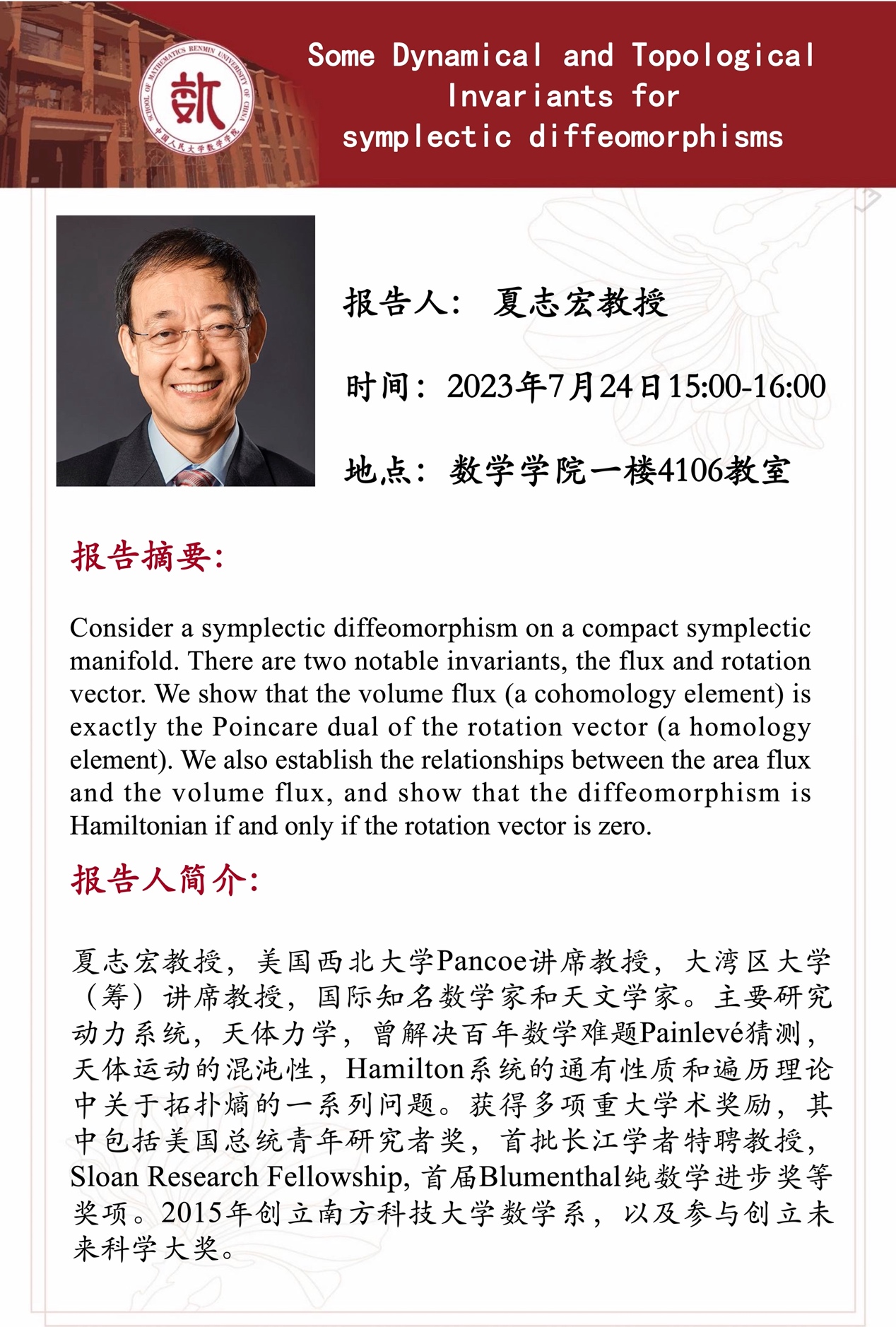 夏志宏教授,美国西北大学Pancoe讲席教授,大湾区大学(筹)讲席教授,国际知名数学家和天文学家。主要研究动力系统,天体力学,曾解决百年数学难题Painlevé猜测,天体运动的混沌性,Hamilton系统的通有性质和遍历理论中关于拓扑熵的一系列问题。获得多项重大学术奖励,其中包括美国总统青年研究者奖,首批长江学者特聘教授,Sloan Research Fellowship, 首届Blumenthal纯数学进步奖等奖项。2015年创立南方科技大学数学系,以及参与创立未来科学大奖等。