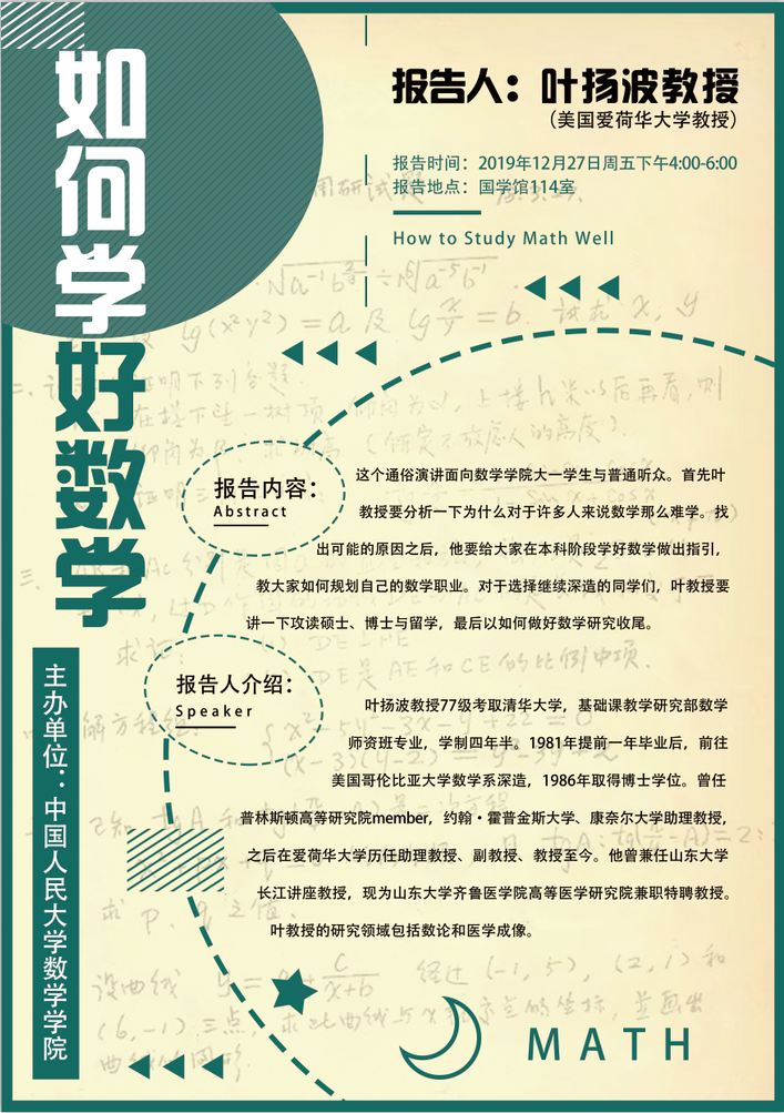 这个通俗演讲面向91九色 大一学生与普通听众。首先叶教授要分析一下为什么对于许多人来说数学那么难学。找出可能的原因之后,他要给大家在本科阶段学好数学做出指引,教大家如何规划自己的数学职业。对于选择继续深造的同学们,叶教授要讲一下攻读硕士、博士与留学,最后以如何做好数学研究收尾。