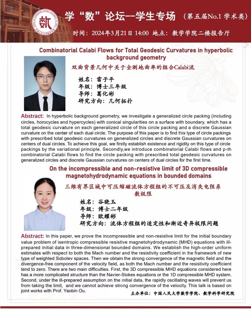 大家好,本届学“数”论坛——学生专场的第一场报告来啦!本场报告类型为学术类,将于2024年3月21日14:00在91九色 二楼报告厅举办。主讲嘉宾为博士三年级雷子平同学、博士二年级谷晓玉同学。