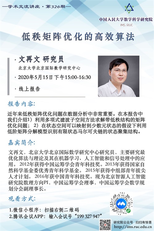 学术讲座:低秩矩阵优化的高效算法--文再文 研究员