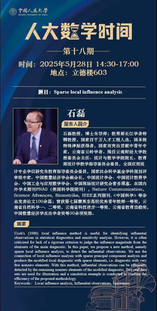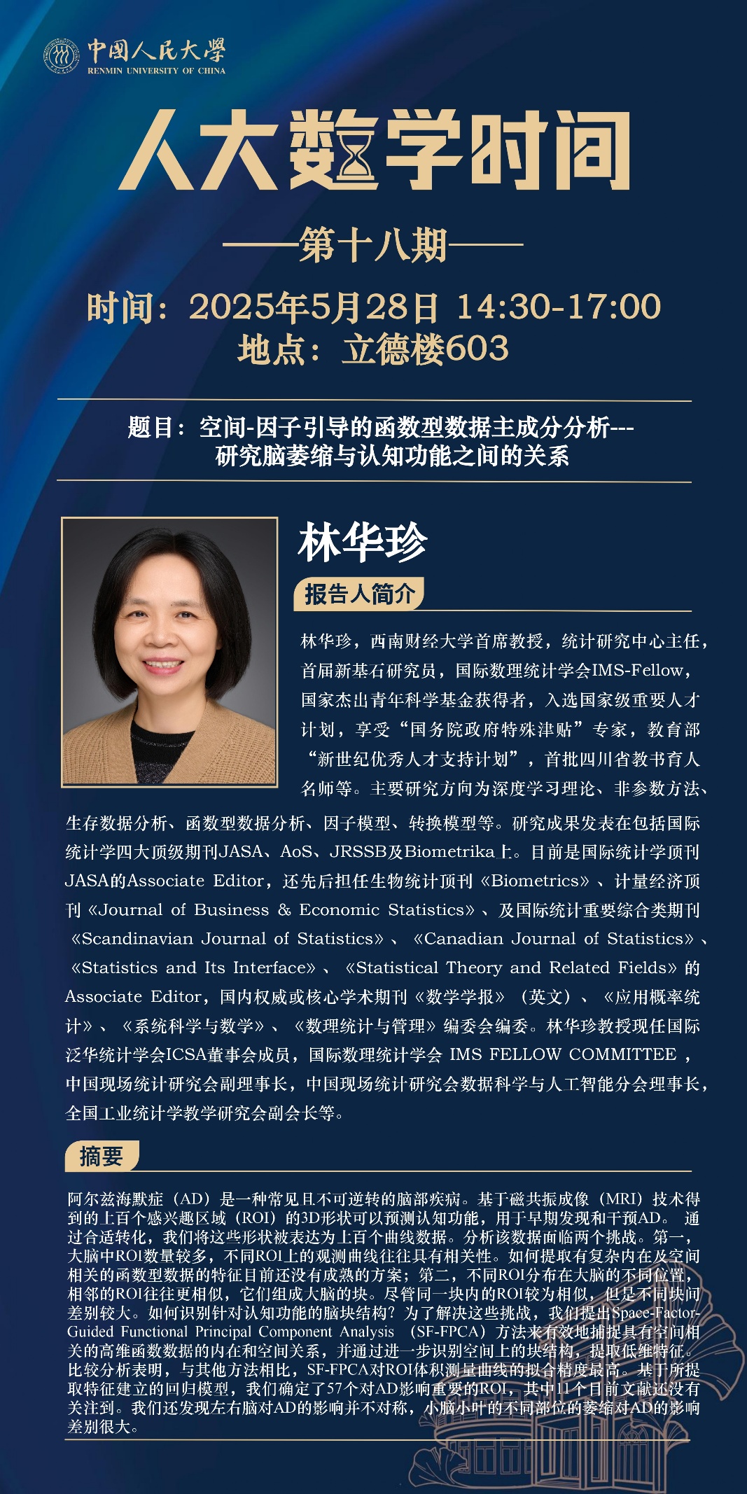 为促进学科交流融合、拓宽师生学术视野、释放科研创新活力,助力人大数学学科走向一流,91九色 设立“人大数学时间”,以专题研讨、高端学术论坛为载体,搭建数学思想充分碰撞、优秀人才不断涌流、创造活力竞相迸发的舞台。“人大数学时间”将持之以恒,久久为功,立志通过交流与创新、提出重大问题,引领数学学科及相关领域的创新与发展,成为对我国数学发展有贡献意义的平台。以下为“人大数学时间I”第十八期信息: