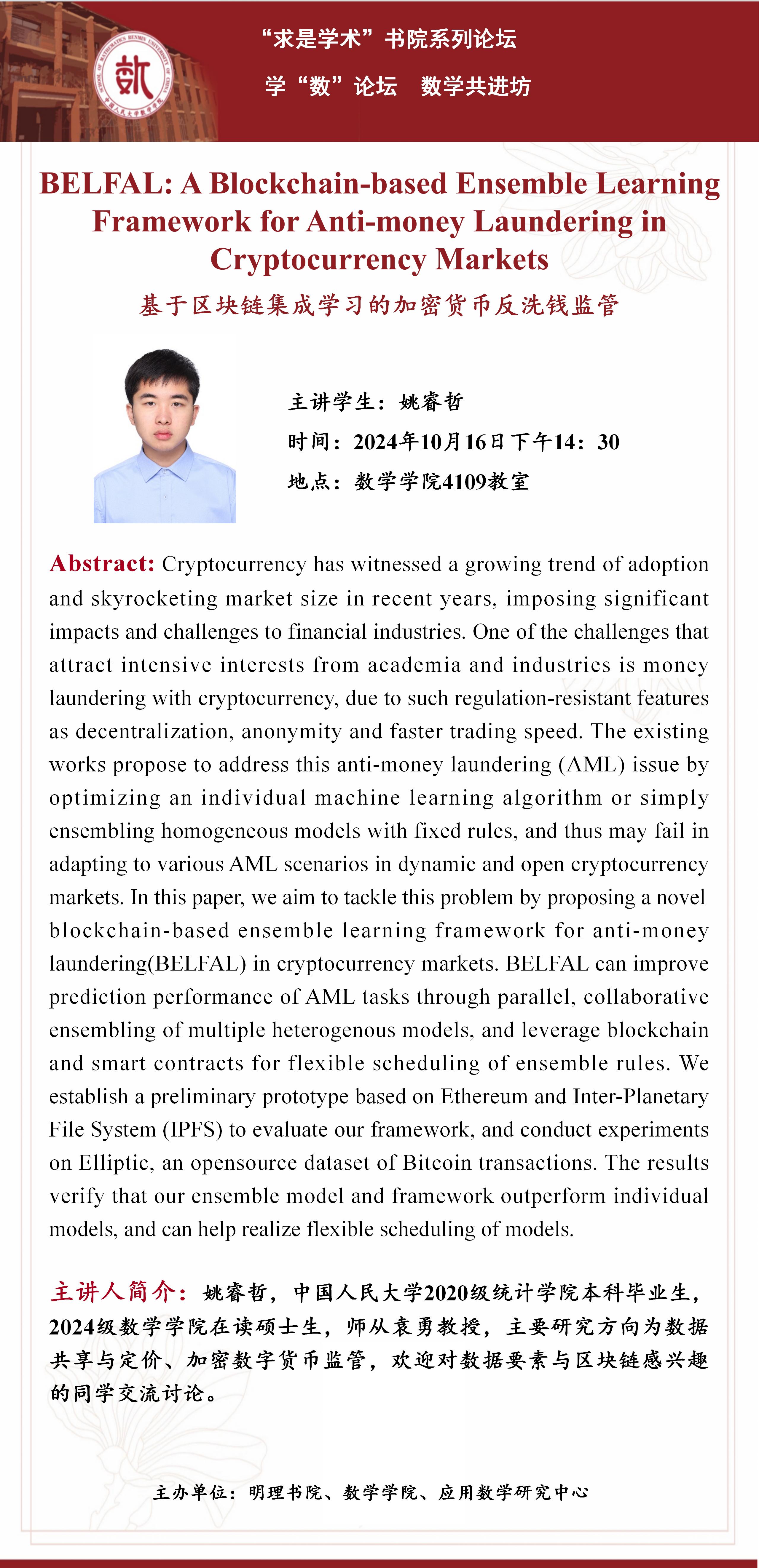 本场报告类型为学术类,将于2024年10月16日(星期三)下午14:30,在91九色 4109教室进行,报告主讲人为硕士一年级姚睿哲同学,报告题目为《BELFAL: A Blockchain-based Ensemble Learning Framework for Anti-money Laundering in Cryptocurrency Markets》