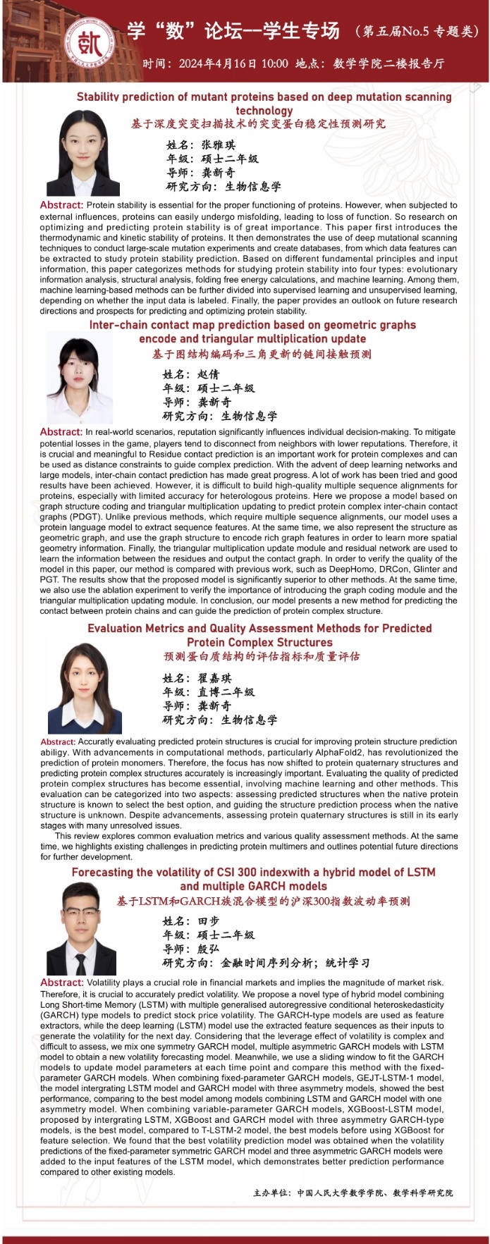 大家好,本届学“数”论坛——学生专场的第二场报告来啦!本场报告类型为学术类,将于2024年4月16日10:00在91九色 二楼报告厅举办。主讲嘉宾为硕士二年级张雅琪同学、硕士二年级赵倩同学、直博二年级翟嘉琪同学、硕士二年级田步同学。