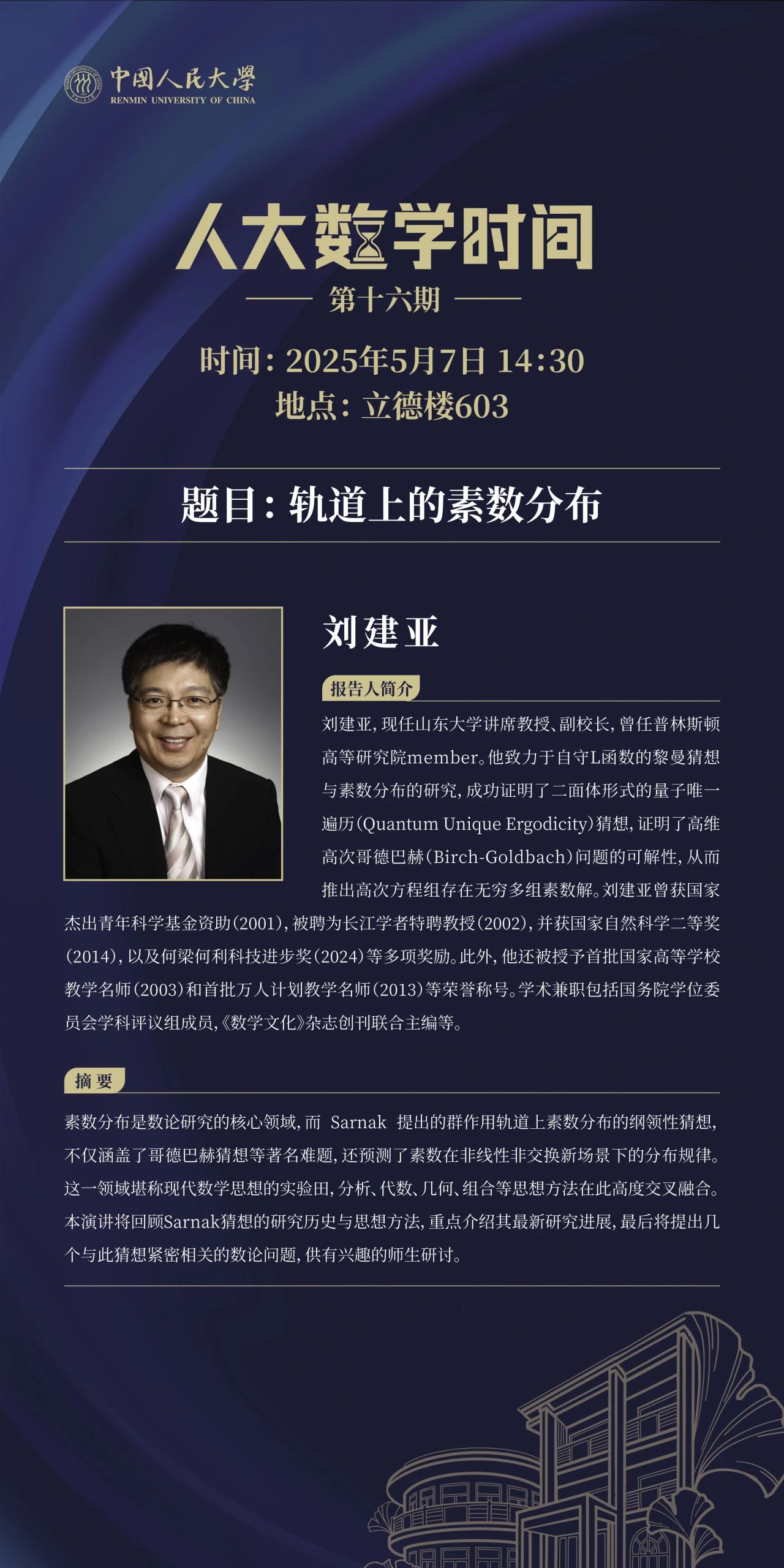 报告人简介:刘建亚,现任山东大学讲席教授、副校长,曾任普林斯顿高等研究院member。他致力于自守L函数的黎曼猜想与素数分布的研究,成功证明了二面体形式的量子唯一遍历(Quantum Unique Ergodicity)猜想,证明了高维高次哥德巴赫(Birch-Goldbach)问题的可解性,从而推出高次方程组存在无穷多组素数解。刘建亚曾获国家杰出青年科学基金资助(2001),被聘为国家高层次人才计划特聘教授(2002),并获国家自然科学二等奖(2014),以及何梁何利科技进步奖(2024)等多项奖励。此外,他还被授予首批国家高等学校教学名师(2003)等荣誉称号。学术兼职包括国务院学位委员会学科评议组成员,《数学文化》杂志创刊联合主编等。