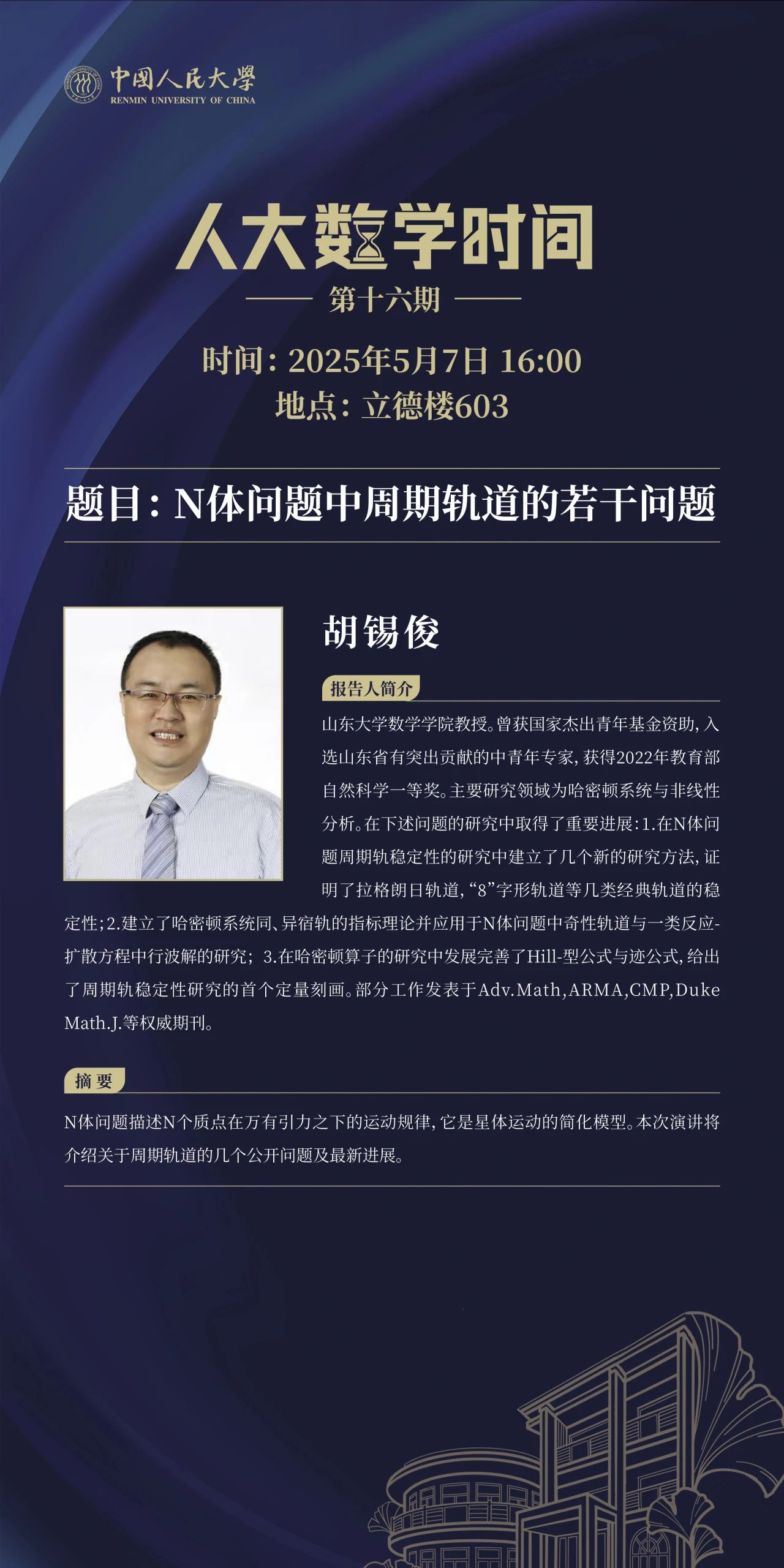 摘要:N体问题描述N个质点在万有引力之下的运动规律,它是星体运动的简化模型。本次演讲将介绍关于周期轨道的几个公开问题及最新进展。