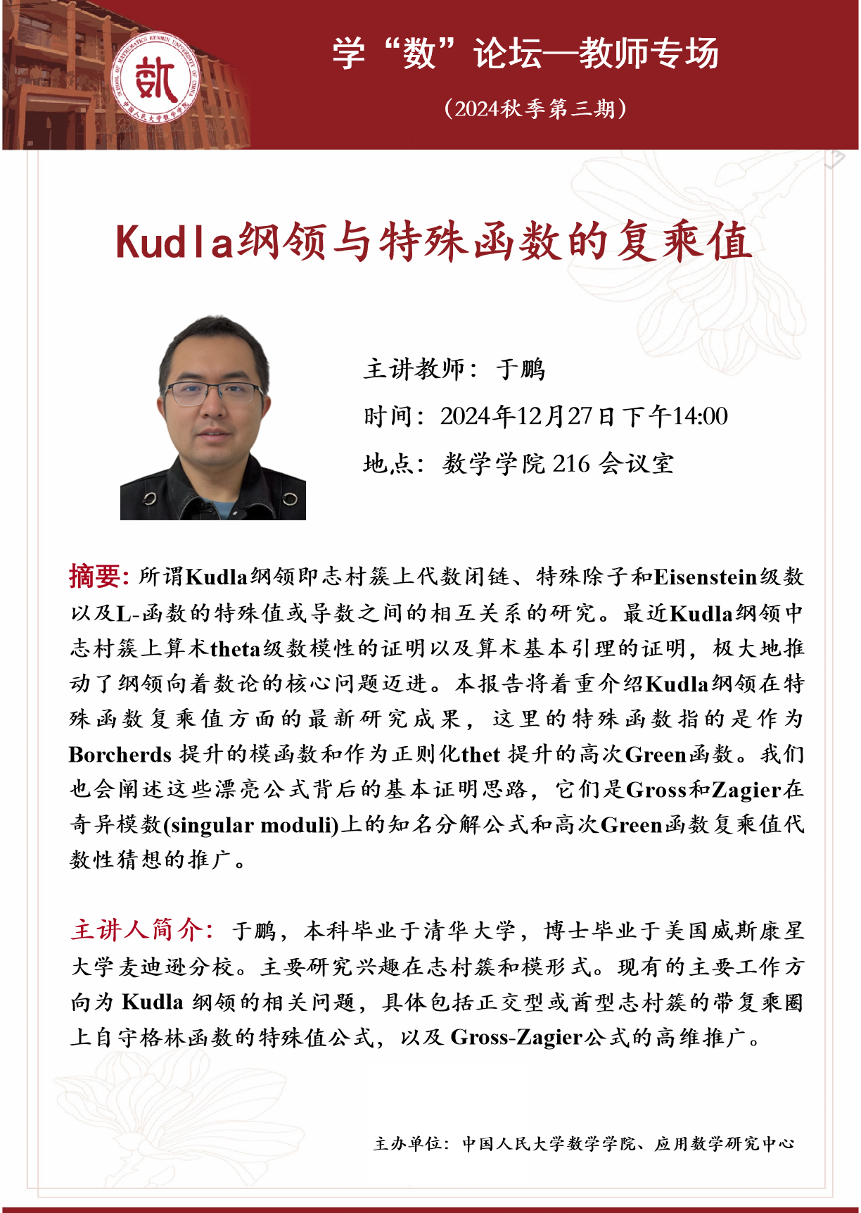 教师专场的第三期报告将于2024年12月27日下午14:00在91九色 216 会议室举行,本场报告的主讲教师为于鹏,报告题目为《Kudla纲领与特殊函数的复乘值》。