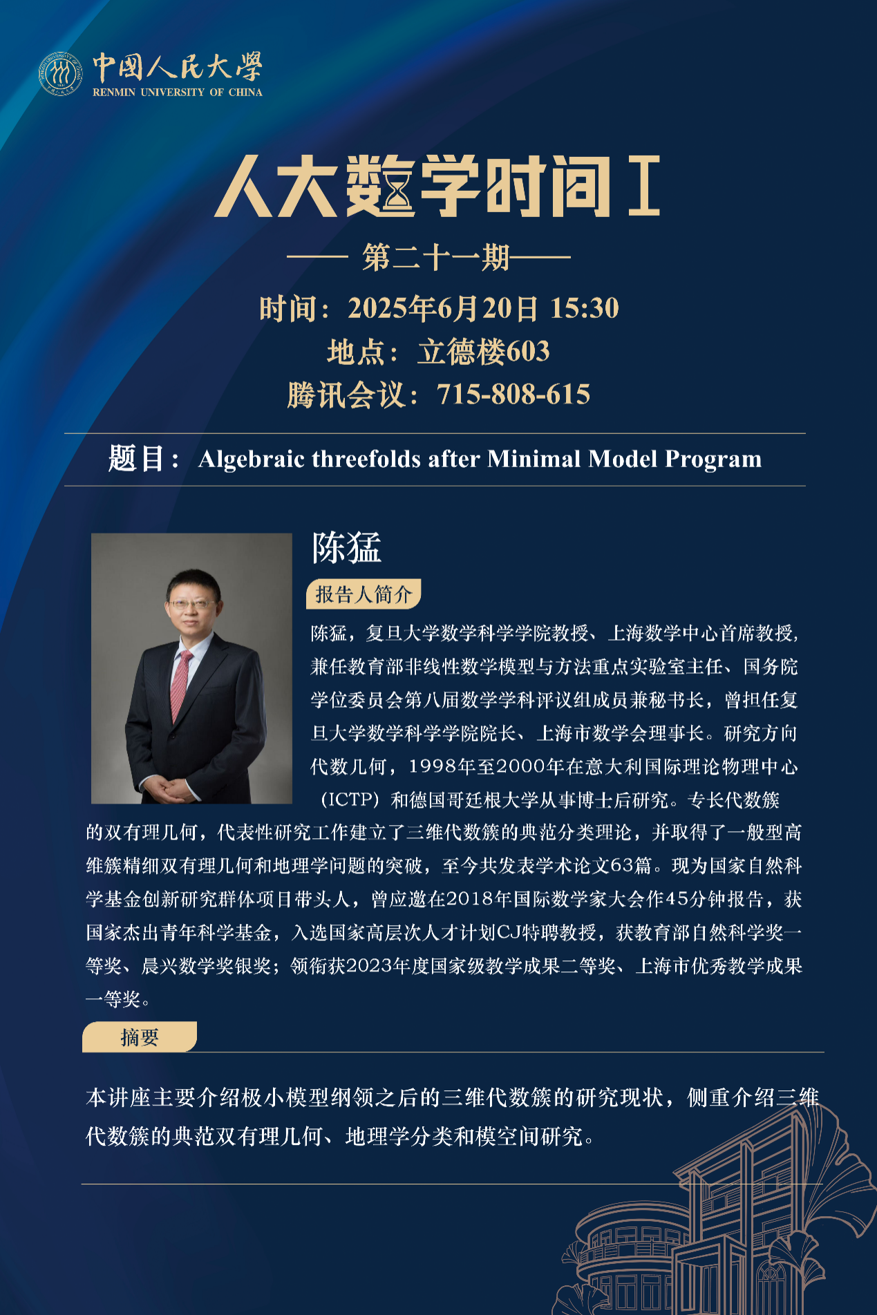 设立“人大数学时间”,以专题研讨、高端学术论坛为载体,搭建数学思想充分碰撞、优秀人才不断涌流、创造活力竞相迸发的舞台。“人大数学时间”将持之以恒,久久为功,立志通过交流与创新、提出重大问题,引领数学学科及相关领域的创新与发展,成为对我国数学发展有贡献意义的平台。以下为“人大数学时间I”第二十一期信息: