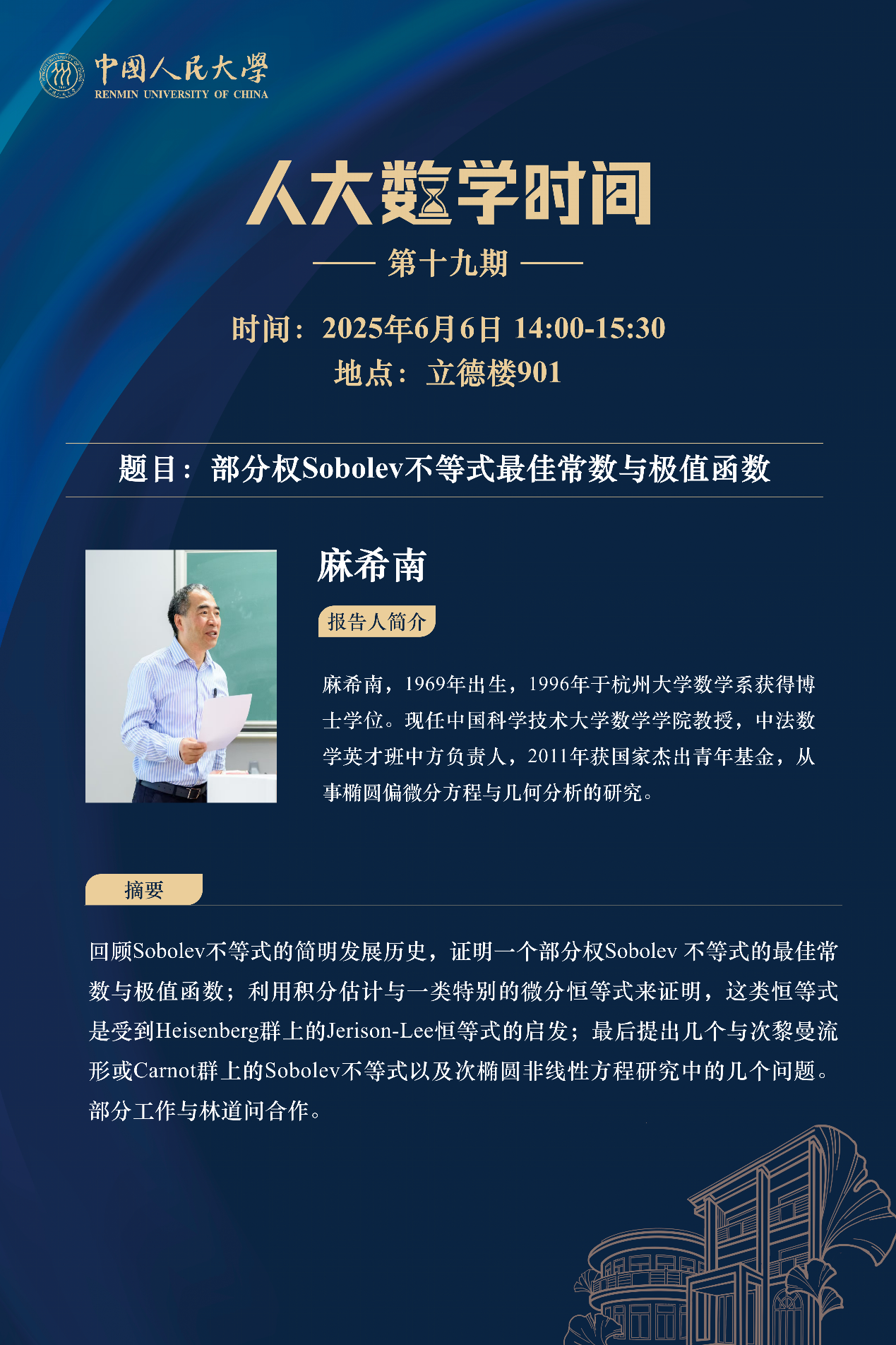 设立“人大数学时间”,以专题研讨、高端学术论坛为载体,搭建数学思想充分碰撞、优秀人才不断涌流、创造活力竞相迸发的舞台。“人大数学时间”将持之以恒,久久为功,立志通过交流与创新、提出重大问题,引领数学学科及相关领域的创新与发展,成为对我国数学发展有贡献意义的平台。以下为“人大数学时间I”第十九期信息:
