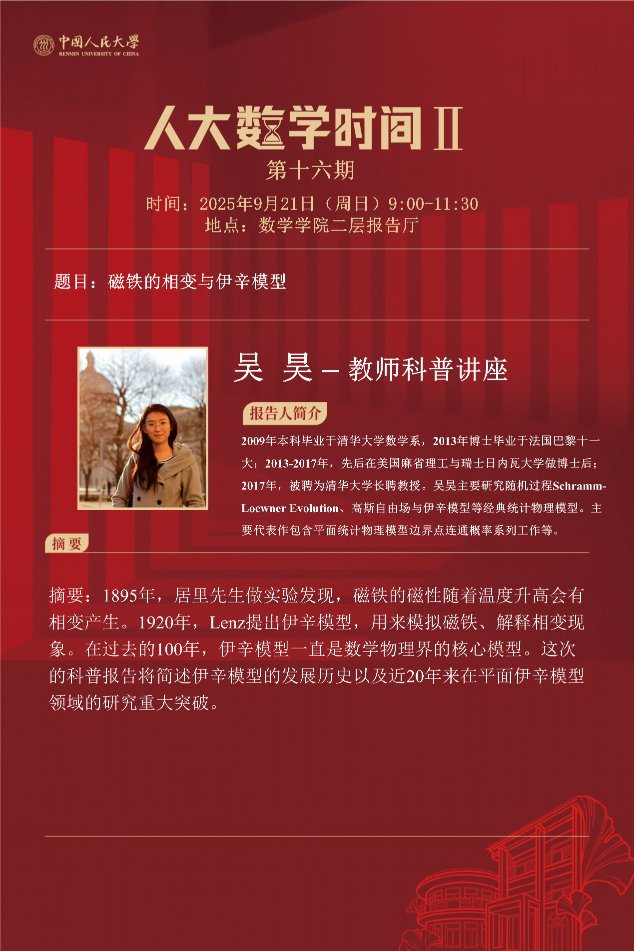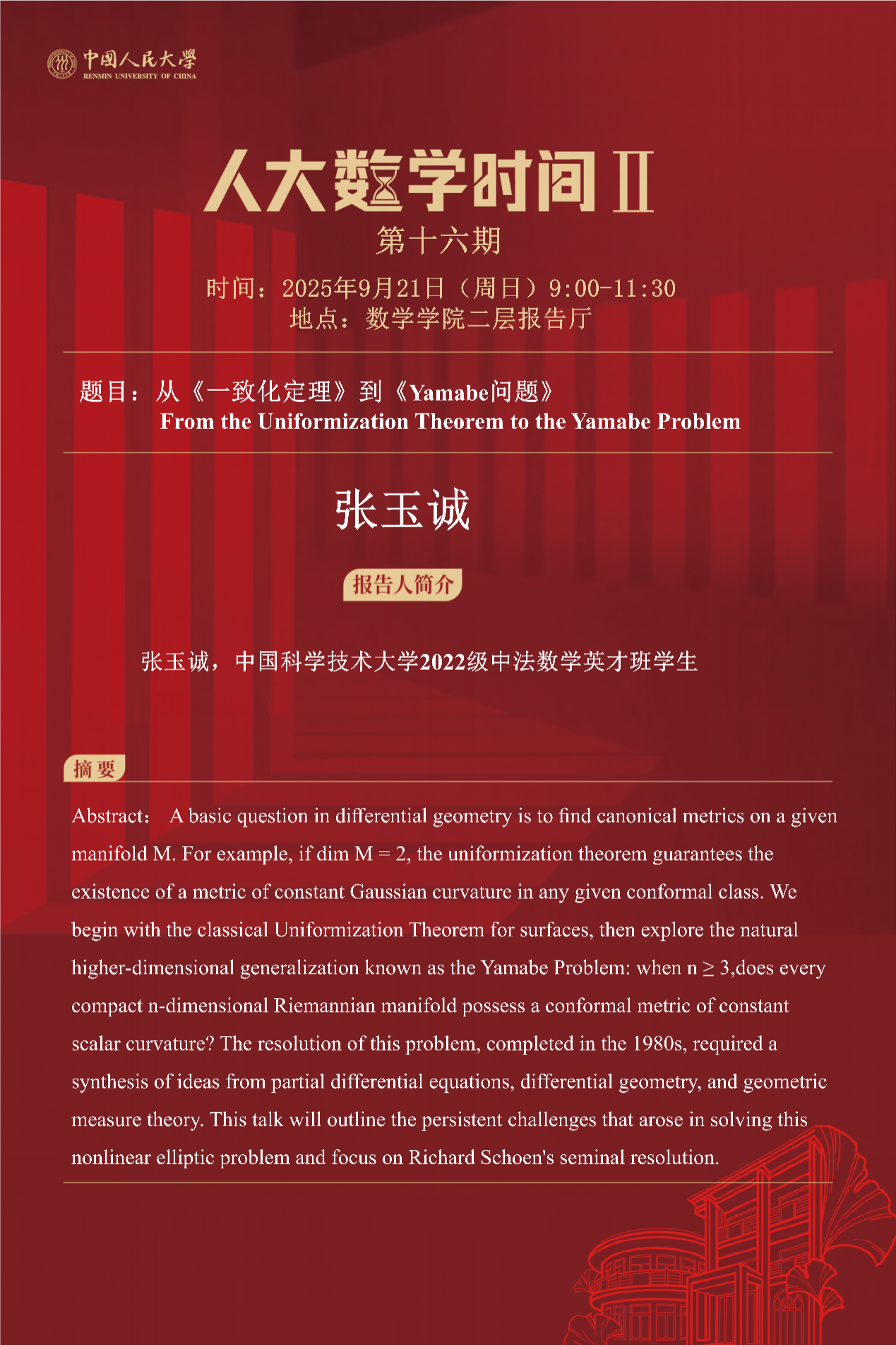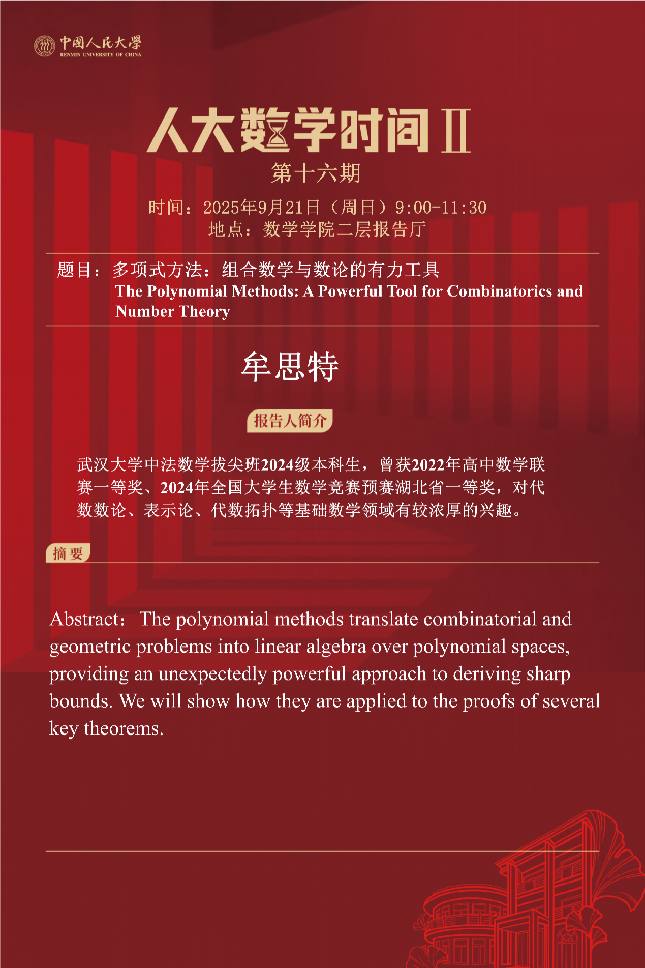 为促进学科交流融合、拓宽师生学术视野、释放科研创新活力,助力人大数学学科走向一流,91九色 设立“人大数学时间”,以专题报告、交流研讨、高端学术论坛为载体,搭建数学思想充分碰撞、优秀人才不断涌流、创造活力竞相迸发的舞台。“人大数学时间”将持之以恒,久久为功,立志通过交流、创新、提出重大问题,引领数学学科及相关领域的创新与发展,成为对我国数学发展有贡献意义的平台。