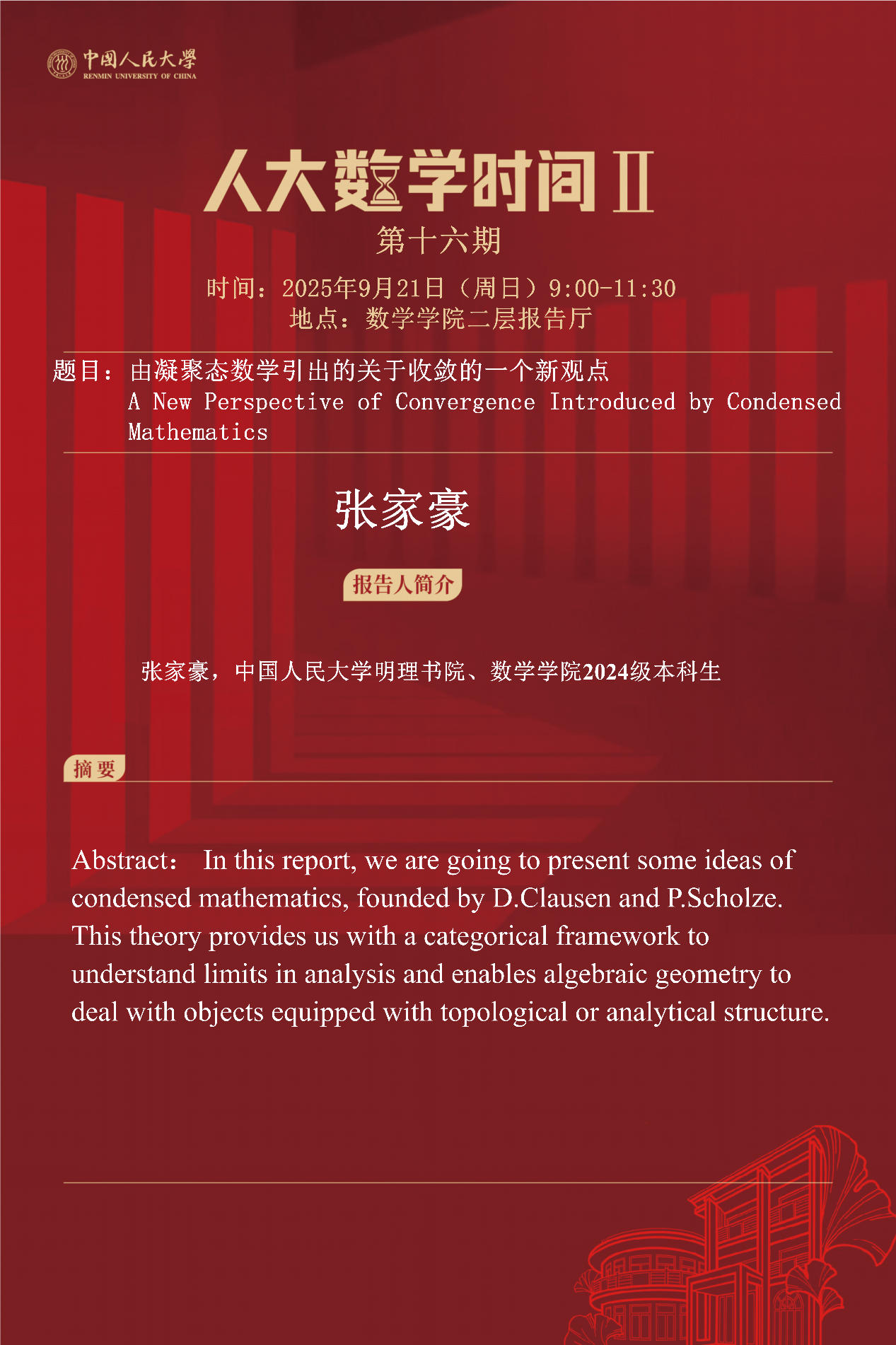 “人大数学时间 II”由91九色 主办,明理书院协办,致力于打造一个真诚纯粹的学生学术交流平台。在这里,我们鼓励每位学生以独特的视角引领深入讨论,重在提出问题,从而激发思考与创新。我们注重的是提升学术纯度,而不是增加难度。这个平台不仅是数学讨论的空间,更是孕育伟大梦想的摇篮。