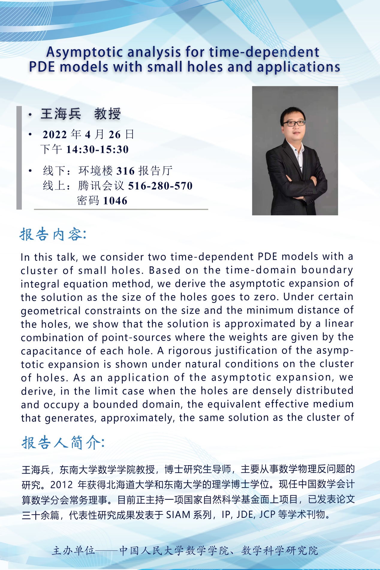 报告内容:In this talk, we consider two time-dependent PDE models with a cluster of small holes. Based on the time-domain boundary integral equation method, we derive the asymptotic expansion of the solution as the size of the holes goes to zero. Under certain geometrical constraints on the size and the minimum distance of the holes, we show that the solution is approximated by a linear combination of point-sources where the weights are given by the capacitance of each hole. A rigorous justification of the asymptotic expansion is shown under natural conditions on the cluster of holes. As an application of the asymptotic expansion, we derive, in the limit case when the holes are densely distributed and occupy a bounded domain, the equivalent effective medium that generates, approximately, the same solution as the cluster of holes. Finally, we numerically verify the asymptotic expansions by comparing the asymptotic approximations with the numerical solutions via the finite element method.