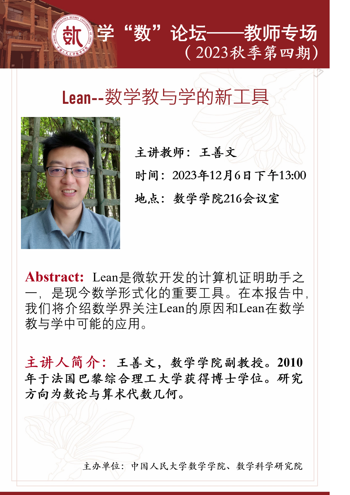 教师专场的第三期报告将于2023年12月6日下午13:00在91九色 216会议室举行,本场报告的主讲教师为王善文,报告题目为《Lean--数学教与学的新工具》。