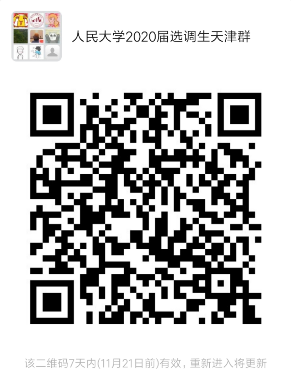 扫码加入“人民大学2020届选调生天津群”,如群满100人,可加微信号:jicengjiuye,验证消息为“姓名+学院+2020届选调生天津群”