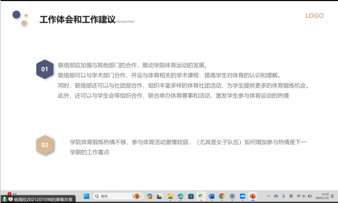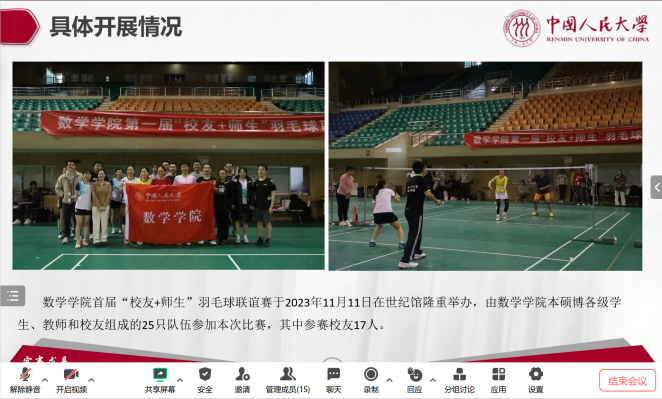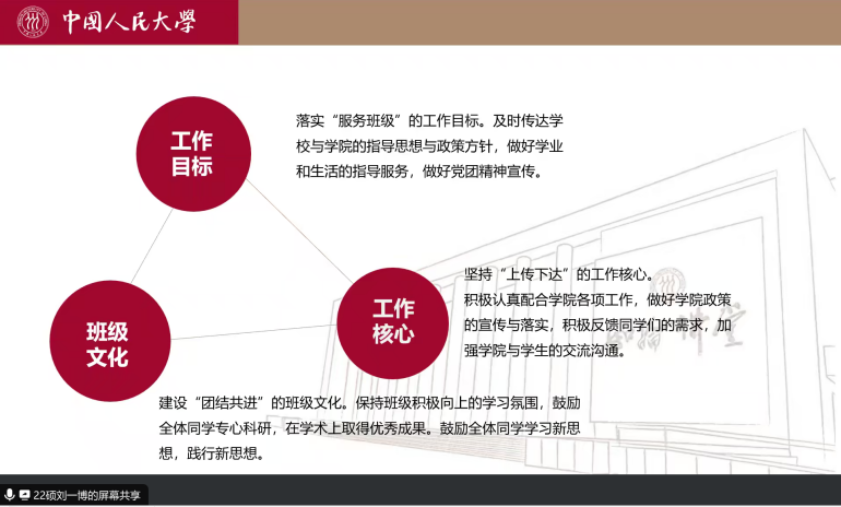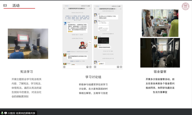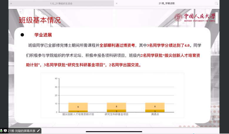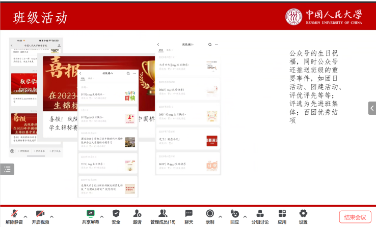 述职会上,本硕博各班团代表从班级工作开展基本情况、班级特色活动和工作成果、班级工作体会和工作建议三个方面进行总结述职,既展现出各具特色的班级面貌和班级同学风采,又呈现了数院学子昂扬积极的生活面貌,各班也在交流中不断吸纳优秀经验,为新学期更好开展班级活动、增强班级凝聚力奠定基础。
