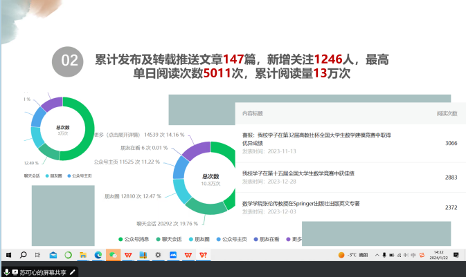 为增进学生骨干间沟通交流,强化学院服务育人实效,1月22日下午,我院召开2023-2024学年秋季学期学生骨干线上述职会,学院党委副书记沈健、团委书记李慧、学生组织主席团成员和全体班团干部参会述职。会议由团委副书记缪亭如主持。
