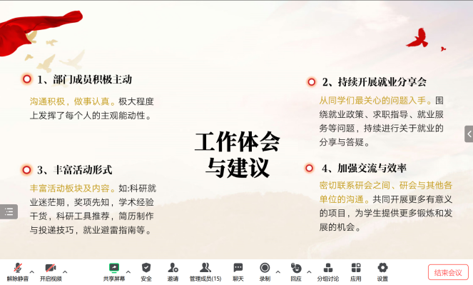 分团委、学生会、新媒体中心、研究生会、党建促进会主席团成员先后从负责组织的基本情况、部门工作成果及特色活动、个人工作心得及建议等方面进行了学期工作的总结汇报,并结合工作开展情况,对新学期的工作进行了规划和展望,力求在做好常规工作的同时探索更丰富的工作形式与工作内容,调动提高同学们参与学院活动的积极性。