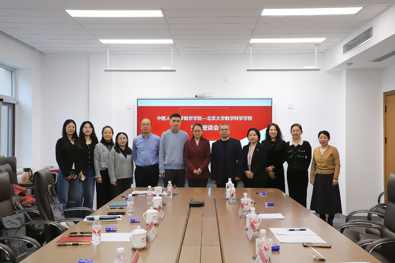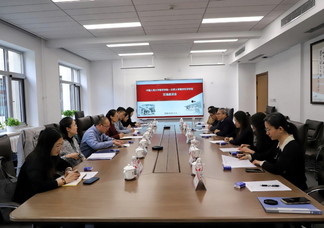 北京大学数学科学学院党委书记胡俊对我院一行的到来表示热烈欢迎,并介绍了北京大学数学科学学院在吸引和培养顶尖数学人才方面的既有成绩与创新举措。柯媛元对北京大学数学科学学院热情接待表示衷心感谢,并介绍了我院的基本情况。调研中,双方就高校数学学科的建设与人才引进策略展开探讨,了解双方在科研服务、本科生与研究生人才培养、党建工作等方面的特色举措,同时探索了两院未来合作的可能路径。北京大学数学科学学院党委副书记兼副院长章志飞、党委副书记董子静参加调研。
