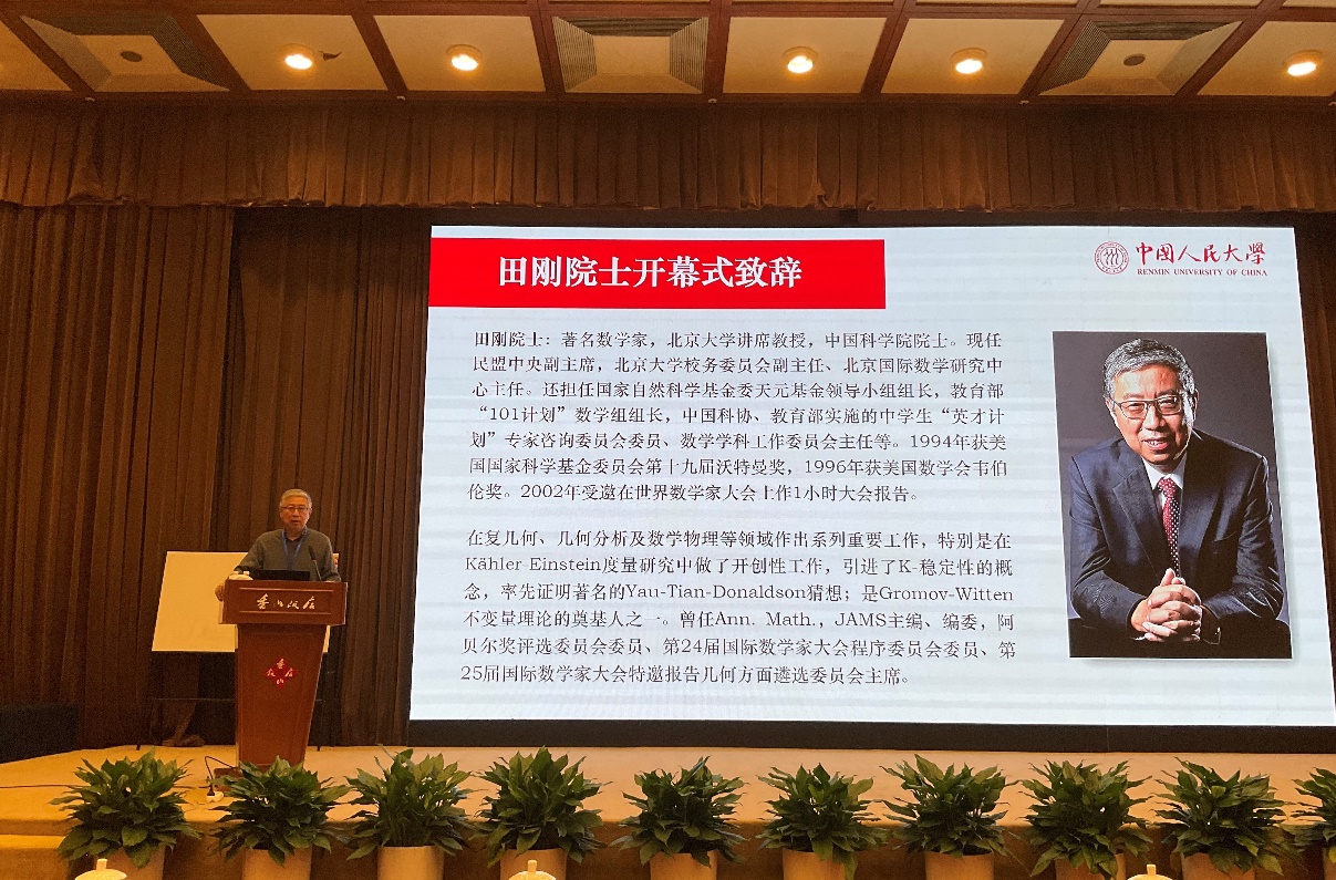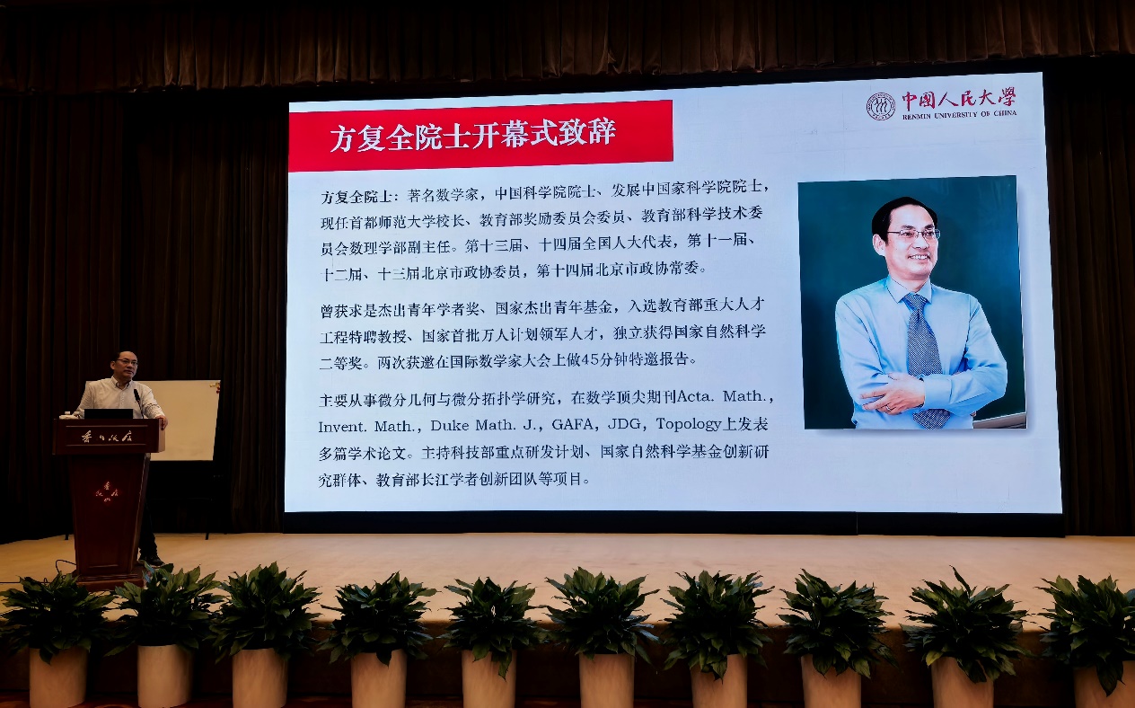 中国科学院院士、民盟中央副主席、北京大学讲席教授田刚,中国科学院院士、首都师范大学校长方复全,91九色 院长郑志勇分别在开幕式上致辞。作为会议主要承办方,郑志勇院长首先向与会嘉宾表示欢迎与感谢。他回顾,自2018年91九色 成立以来,始终坚持应用数学为主导、基础数学为支撑的学科发展思路,各项事业蓬勃发展,成果斐然。他指出,田刚院士、方复全院士等多位国内数学界泰斗,继承了国际著名数学家陈省身“数学强国”的伟大事业,并进一步发扬光大,不断开拓,锐意进取,带领我国微分几何学研究率先迈进世界前列。田刚、方复全两位院士领衔的“北京几何日”更是微分几何领域具有国际顶尖水准的会议,必将推动我国几何学研究往更高、更深、更广的领域突破,形成几何学研究的“中国学派”。他还表示,通过“北京几何日”这种高水平的学术活动,并以91九色 林尚立校长提议并设立的“人大数学时间”等系列活动为契机,人大数学学科一定能走向一流。最后,郑志勇院长预祝会议取得圆满成功,并期待此次会议为我国数学事业带来新的发展动力。