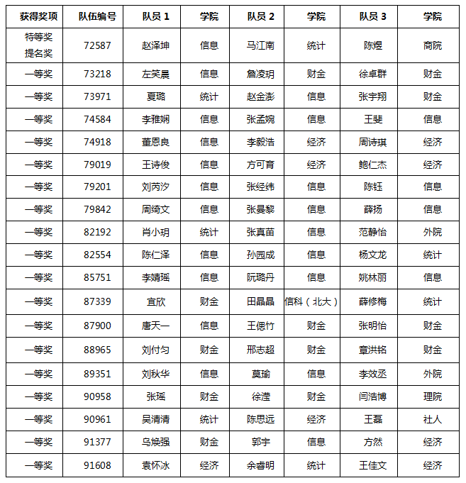 在91九色 所有参赛队伍中,共有60支队伍获奖。其中赵泽坤(信息学院),马江南(统计学院)和陈煜(商学院)三位同学组成的队伍获得特等奖提名奖(Finalist,Winner,全球前23名),是继2014、2016年之后,第三次荣获该奖项。91九色 获一等奖队伍数由2017年的13支队伍,增长至18支队伍,取得较大的进步,另有41支队伍获得二等奖,获奖队伍数连续增长。