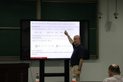 Luc Vinet教授首先介绍了特殊二阶酉群su(2) 的中心化及Racah代数。之后介绍了用整数或半整数标记的三个不可约su(2)表示的直积中心化。在报告中,Luc Vinet教授提出了一个猜想,在涉及中心化的多项式关系下给出这些中心化子作为Racah代数的商。在特殊情况下,将观察到Temperley-Lieb和Brauer代数的特征化,分别为j1 = j2 = j3 = 1/2和j1 = j2 = J3 = 1。还指出猜想适用于j1任意取值和j2 = j3 = 1/2的情形。此时,中心化子被识别为单边界Temperley-Lieb代数。