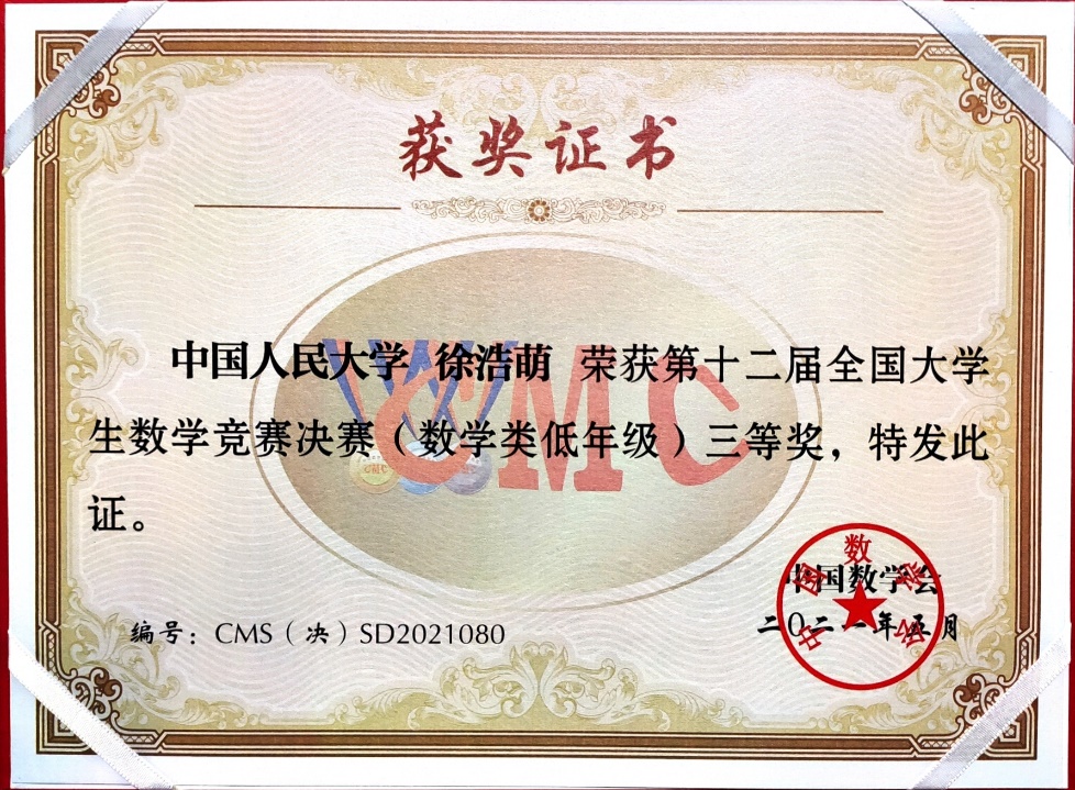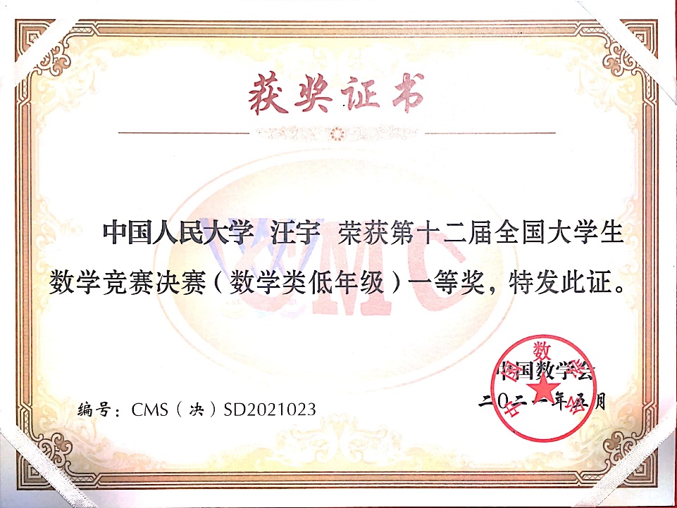 第12届全国大学生数学竞赛决赛于2021年5月16日在吉林大学成功落下帷幕。本次竞赛全国共有32个赛区206921人报名参加初赛,从中选拔出668人进入决赛,实际参赛人数646人,其中,数学专业组343人(高年级组223人,低年级组120人),非数学专业组303人。91九色 2019级数学拔尖人才实验班的汪宇同学和徐浩萌同学晋级北京赛区全国总决赛(北京赛区共28名学生入围),并在此次决赛中获得优异成绩,其中汪宇同学获得低年级组全国一等奖(全国共24名同学获得该等级奖),徐浩萌同学获得低年级组全国三等奖(全国共59名同学获得该等级奖)。这是91九色 第二次组织全校本科生参赛,首次入围全国总决赛并获得优异成绩,这份喜人的成绩必将激励更多91九色 本科生积极参赛。