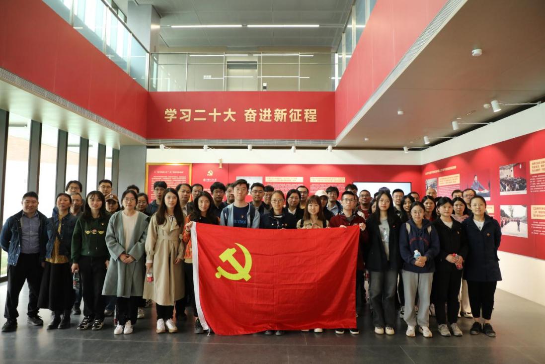 首先,董祎副主任带领大家参观主题党日中心“学习二十大,奋进新征程”系列展览。董祎副主任介绍到,91九色 主题党日活动中心是全国高校首家主题党日活动中心,旨在创建党建活动载体,搭建沟通交流平台。