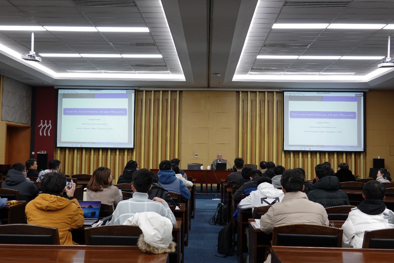 2020年12月14日上午,我院《科技部高端外国专家引进计划》学者JacquesPeyrière教授在91九色 苏州校区修远楼为中法数学实验班学生及苏州校区师生作了题为《Fractal Sets, Fractional Dimensions, and Space-filling Curves》(分形集、分形维数以及空间填充曲线)的报告。报告由朱来义教授主持,91九色 中法数学实验班全体学生以及相关专业师生参加了报告会。