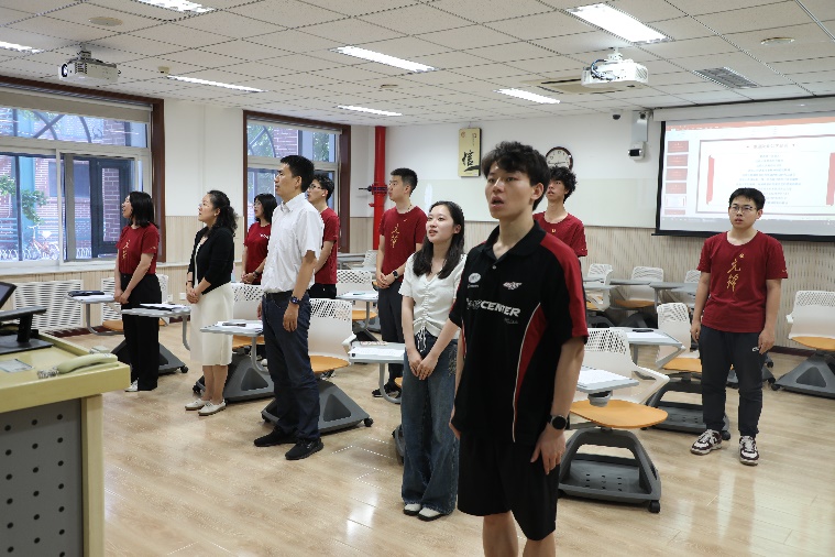仪式的尾声,大家共同奏唱起庄严的团歌,激昂的旋律回荡在会场之中。大家用嘹亮的歌声来表达对革命先烈的崇高敬意,以及新时代团员团结一心、砥砺前行的坚定信念。正如歌词所唱:“五四的火炬,点亮了民族的希望,辉煌的事业,引领我们前行。”随着团歌的结束,本次仪式圆满落幕,新团员们必将铭记使命,怀揣着青春的热血与梦想,继续为开创更加美好的未来而努力奋斗!