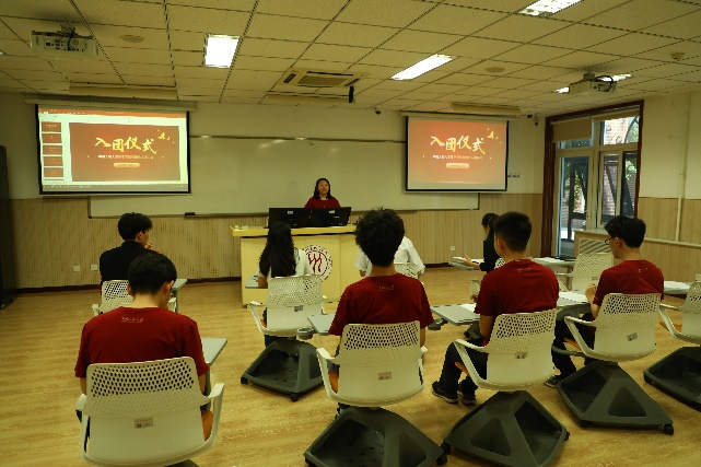 在全体师生高唱国歌的庄严氛围中,仪式拉开帷幕。主持人宣布新团员名单,沈健老师、李慧老师、优秀党员代表陈露希和优秀团员代表黄玙凡为新团员颁发了团徽徽章和团员证。