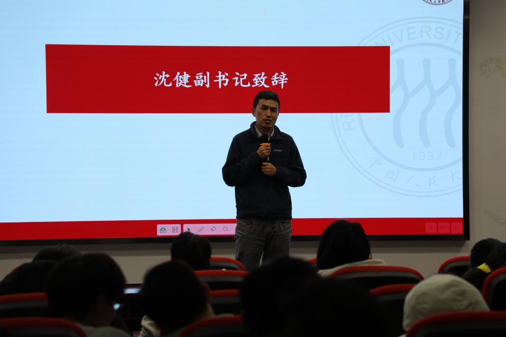 大会在庄严的国歌声中隆重开始,党委副书记沈健老师致辞。他充分肯定了本次共青团91九色 第二次代表大会召开的意义,强调坚持“以党建带团建”的工作思路,勉励广大团员代表坚定听党话、跟党走的政治信念,提高身份意识,在思想、工作及生活中发挥先锋模范作用。沈健老师代表学院向大会筹备工作组成员以及全体参会代表表示衷心感谢,并预祝本次团员代表大会召开及新一届团委委员选举工作取得圆满成功。