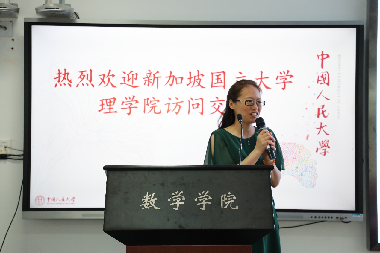 柯媛元书记首先对新加坡国立大学理学院代表团的到来表示热烈而亲切的欢迎,并详细介绍91九色 历史与发展进程。她表示学院自成立以来,锐意进取,在学科建设、人才培养、学术研究和国际交流等方面都取得了长足的发展。在学院发展进程中,我院始终坚持国际化办学,鼓励学生走出去,大力提升数学学科师资国际化程度。她认为两院未来的合作可以更加深入、多元,增强学生间、教师间、院系间的联系,并在科研项目、暑期学校、会议论坛等方面进一步展开合作。