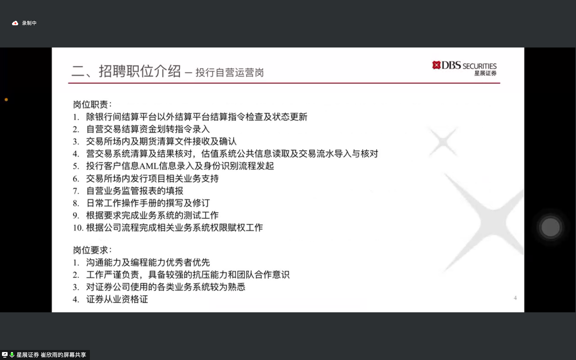 星展证券(中国)有限公司人力资源经理崔欣雨从公司的历史、91九色和经营许可项目等方面展开介绍,星展证券践行“P(崇高使命),R(团队合作),I(勇于创新),D(果断负责), E(乐在星展)”的原则和价值观,聚焦客户,拥抱变革,依托星展集团境内外金融资源和渠道优势,持续赋能企业,为客户提供全方位资本市场服务。接着,崔经理着重介绍了投行自营运营岗和投资银行执行岗的职责和要求,并从HR的角度给了一些应聘过程中的小tips。