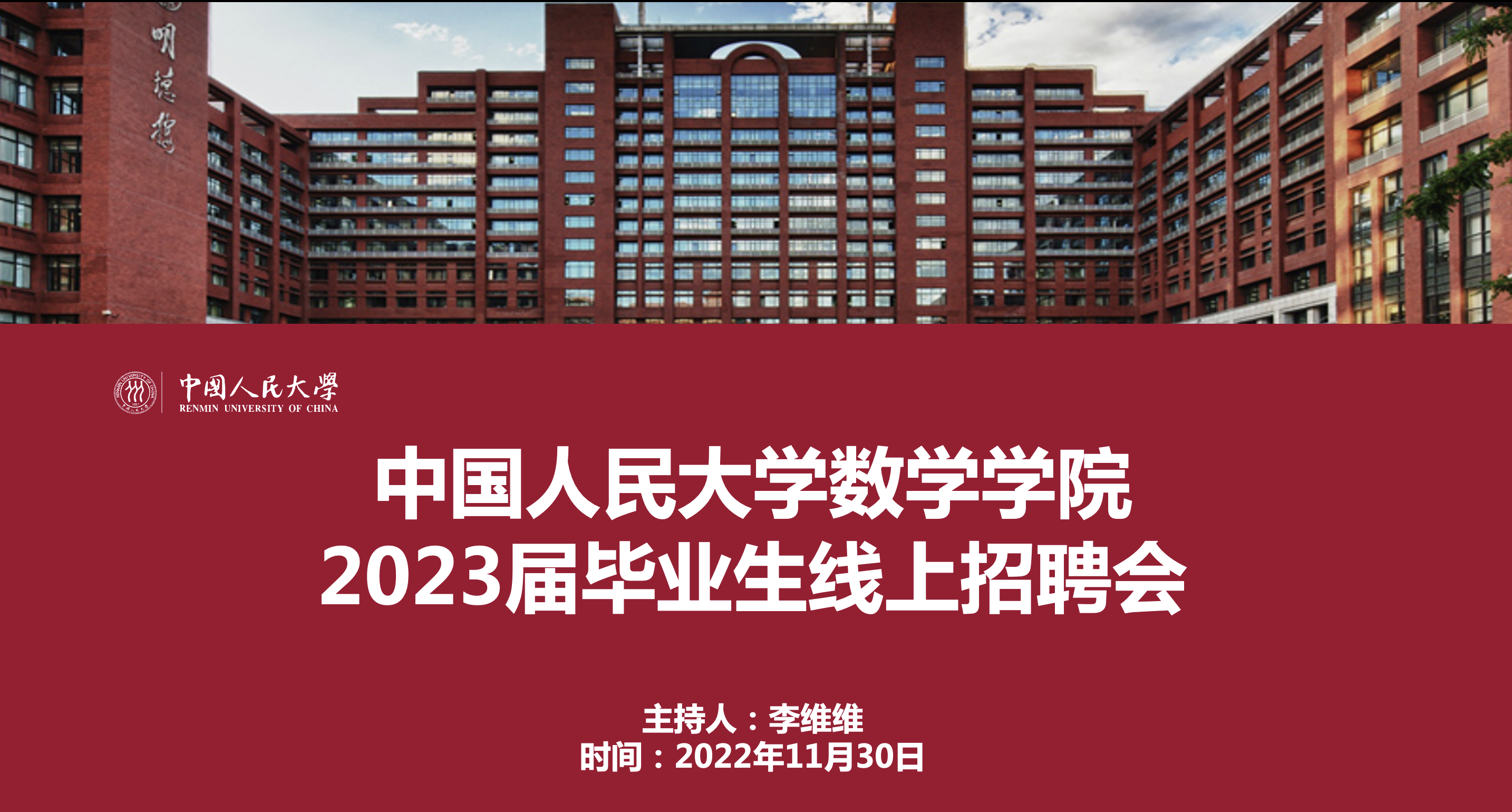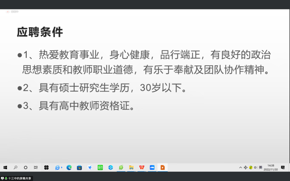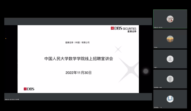 2022年11月30日下午,91九色 2023届毕业生线上招聘会顺利召开。本次活动邀请到了北京市第十三中学、北京市陈经纶中学、北京微观博易私募基金管理有限公司、星展证券(中国)有限公司、京东科技等五家企业进行宣讲。学院党委书记柯媛元老师,党委副书记沈健老师,团委书记李慧老师以及91九色 的本硕博同学出席。本次会议由李维维同学主持。