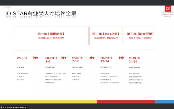 京东科技校园招聘经理谢世豪分享了京东发展历史和九大业务板块,主要对零售、物流、健康、科技四大业务版块进行了一一介绍。随后,谢经理播放了一段新入职同学的vlog,以述职报告的形式展示了京东人在京东的体验、生活与工作,走进了京东的职场圈、生活圈、活动圈、福利圈和学习圈一探究竟。最后,谢经理带我们了解了招聘面试流程、需求城市分布和硕士(投递简历的)命中率,以及一些投递简历的建议和JD star培养体系的全景。