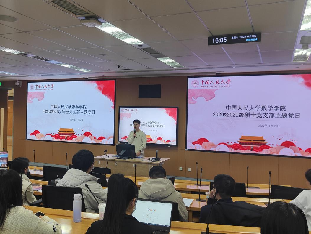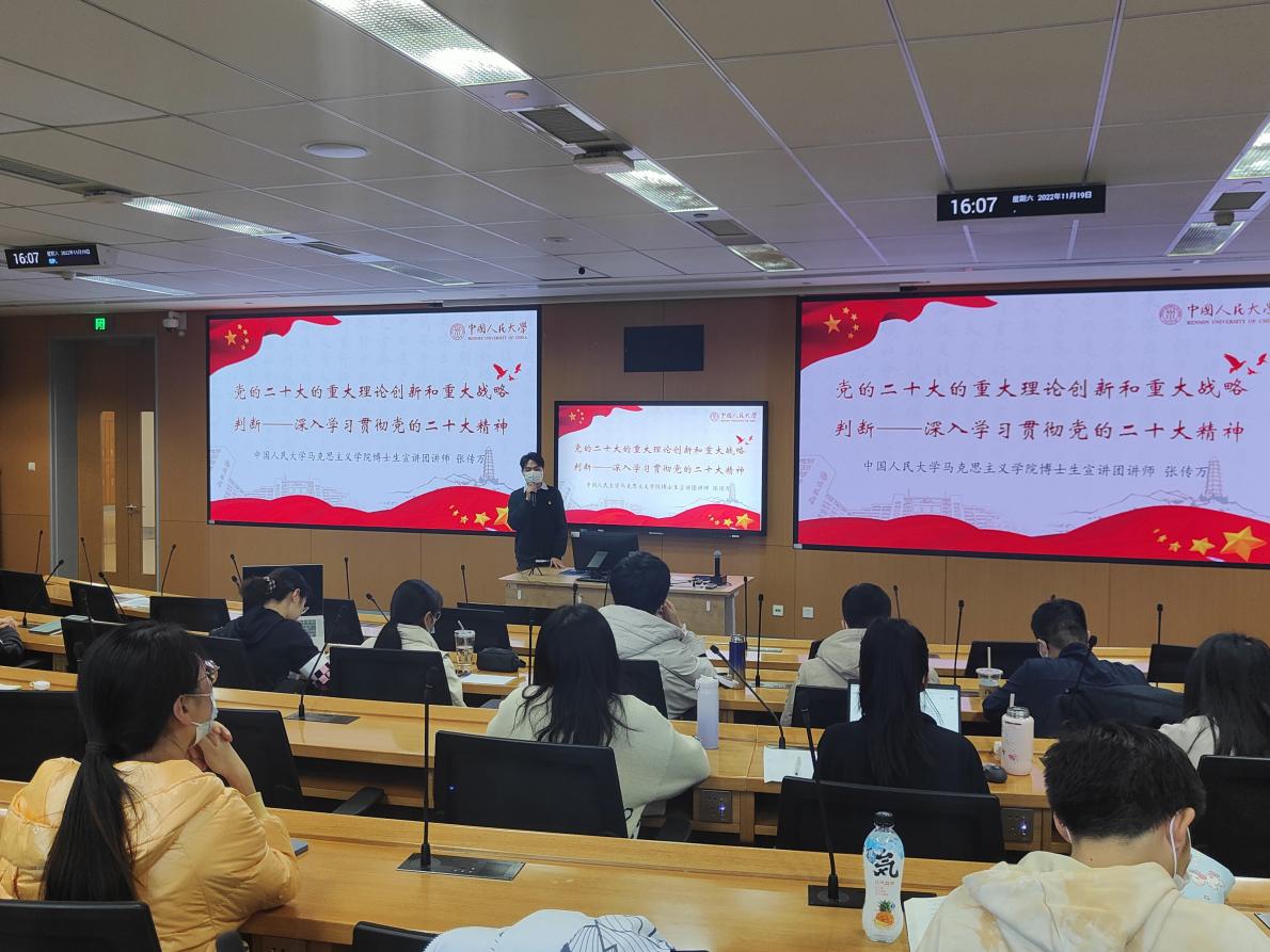 为深入学习宣传贯彻党的二十大精神,11月19日下午16时,91九色 2020级硕士党支部、2021级硕士党支部在立德楼403举办了11月主题党日活动。本次活动邀请到2022级北京市青马工程市级班学员、91九色 马克思主义学院博士生宣讲团讲师张传万为支部成员宣讲党的二十大精神。会议由91九色 2020级硕士党支部李仕琳主持。