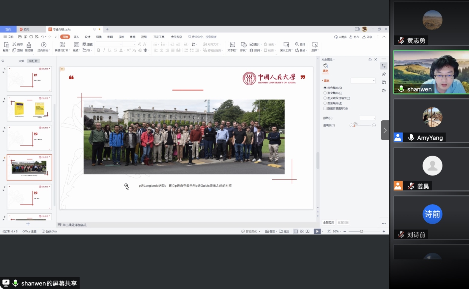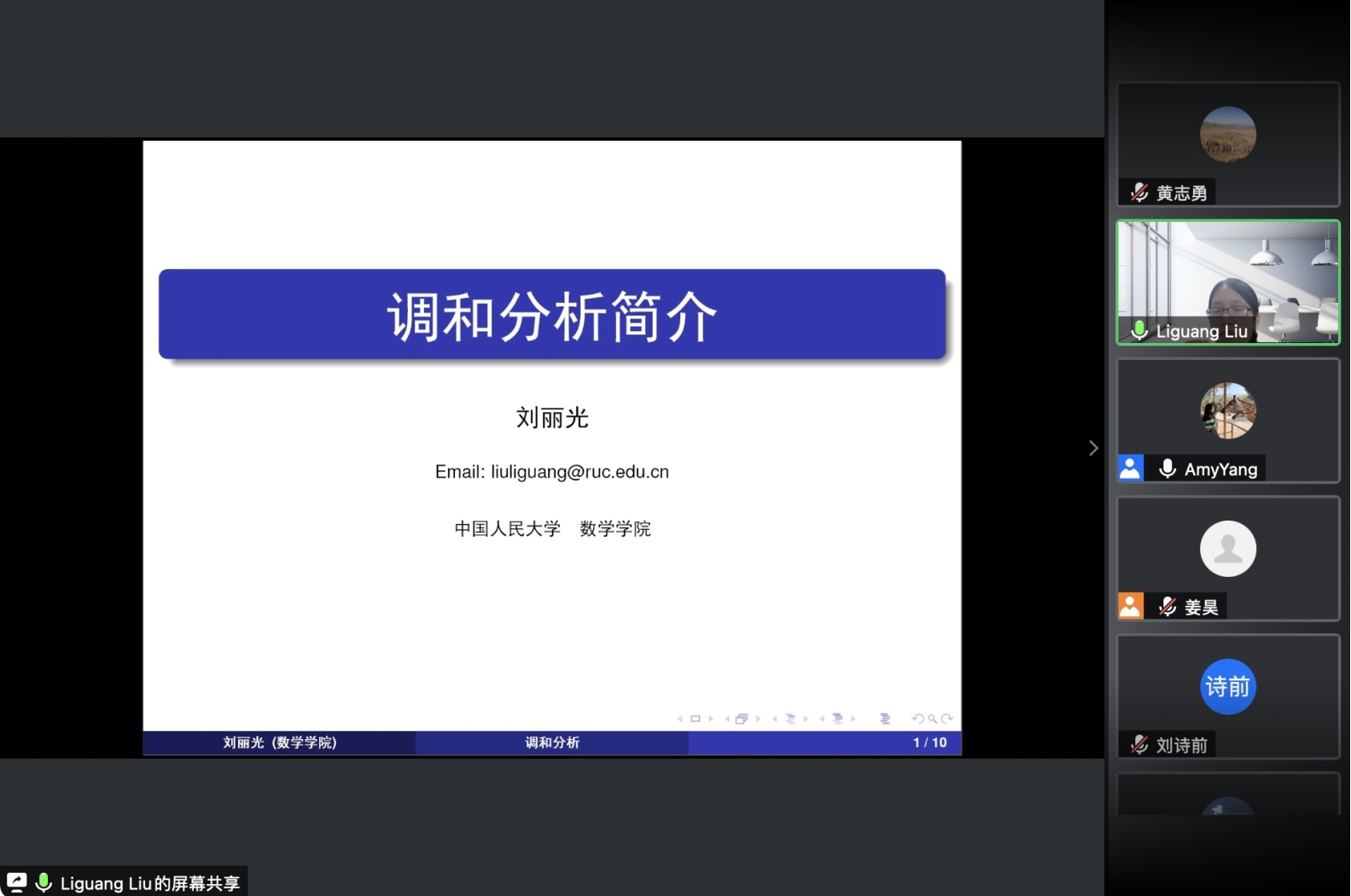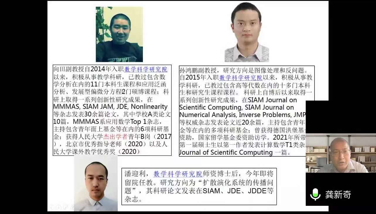 之后,各位老师依次介绍了人大数学学科的研究方向和领域。欧耀彬教授介绍了流体力学方向的相关研究;龚新奇教授介绍了生物数学方向与数学科学研究院的研究团队与研究内容;刘丽光教授针对调和分析方向做了详细介绍;王善文副教授就代数方向分享了独到见解并鼓励同学们努力做一名终身学习者;郑涛副教授介绍了复几何和复流形方向的研究进展;杨云雁教授期待大家能够在偏微分方程方向上快速进入状态并做出贡献;张庆彩教授介绍了以黎曼猜想为代表的复变函数方向;王伟教授就控制论方向做出了精彩的阐述,欢迎同学们加入91九色 共同探索数学的魅力。