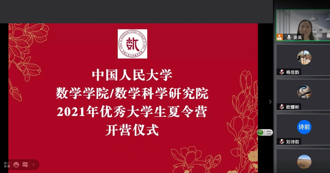 2021年7月16日上午,91九色 和数学科学研究院2021年优秀大学生夏令营举办开营仪式。此次夏令营共有来自全国知名高校的近300名同学递交申请。经过初选,有72位同学获得参加夏令营的资格。开营仪式通过腾讯会议线上举行,91九色 党委副书记黄志勇老师、副院长柯媛元老师出席,由姜昊老师主持。整个仪式包括学科介绍、方向介绍、实验室介绍等环节,丰富的内容令同学们表示收获颇丰。