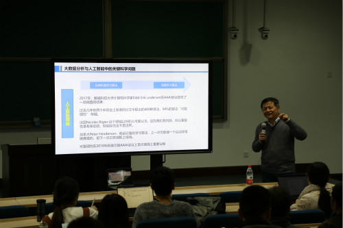2018年11月23日下午,91九色 明德数学讲堂系列第四讲,在国学馆114室成功举办。中国科学院院士、北京航空航天大学教授郑志明教授应邀,做题为“基于大数据的确定性小概率事件发现方法及应用”的报告。